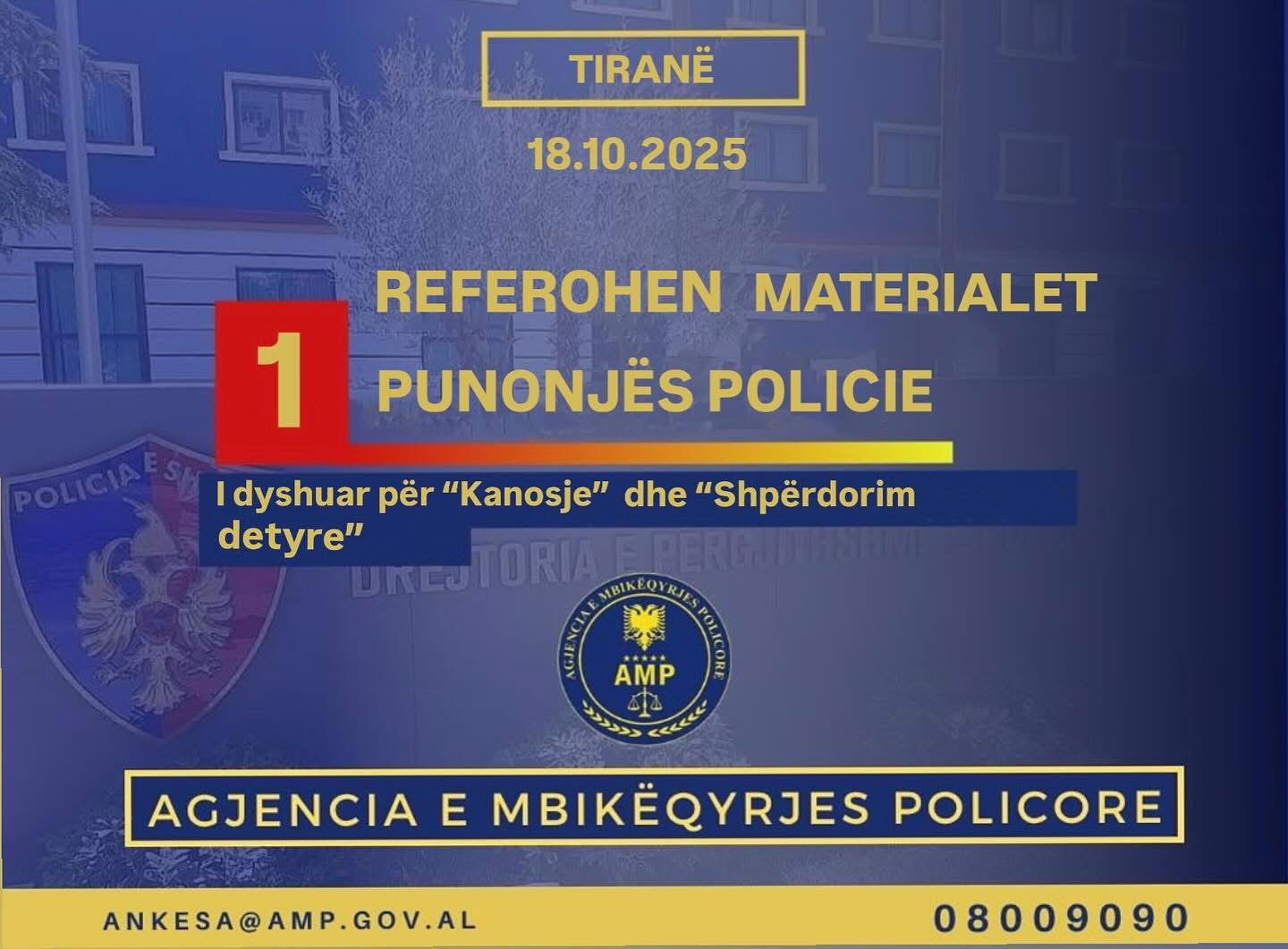 Agjencia e Mbikëqyrjes Policore (Rajoni Tiranë) ka referuar në Prokurorinë Pranë Gjykatës së Shkallës së Parë të Juridiksionit të Përgjithshëm Tiranë materialet proceduriale në ngarkim të punonjësit të policisë E. H., me detyrë Patrullë e Përgjithshmë në Komisariatin e Policisë Nr.5, i dyshuar për kryerjen e veprave penale “Kanosja” dhe “Shpërdorim i detyrës”.