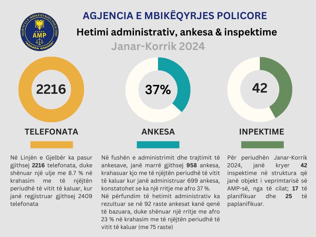 Sa i përket veprimtarisë administrative të Agjencisë së Mbikëqyrjes Policore, në aspekt krahasimor për periudhën analizuese Janar – Korrik 2023/2024, rezulton se: