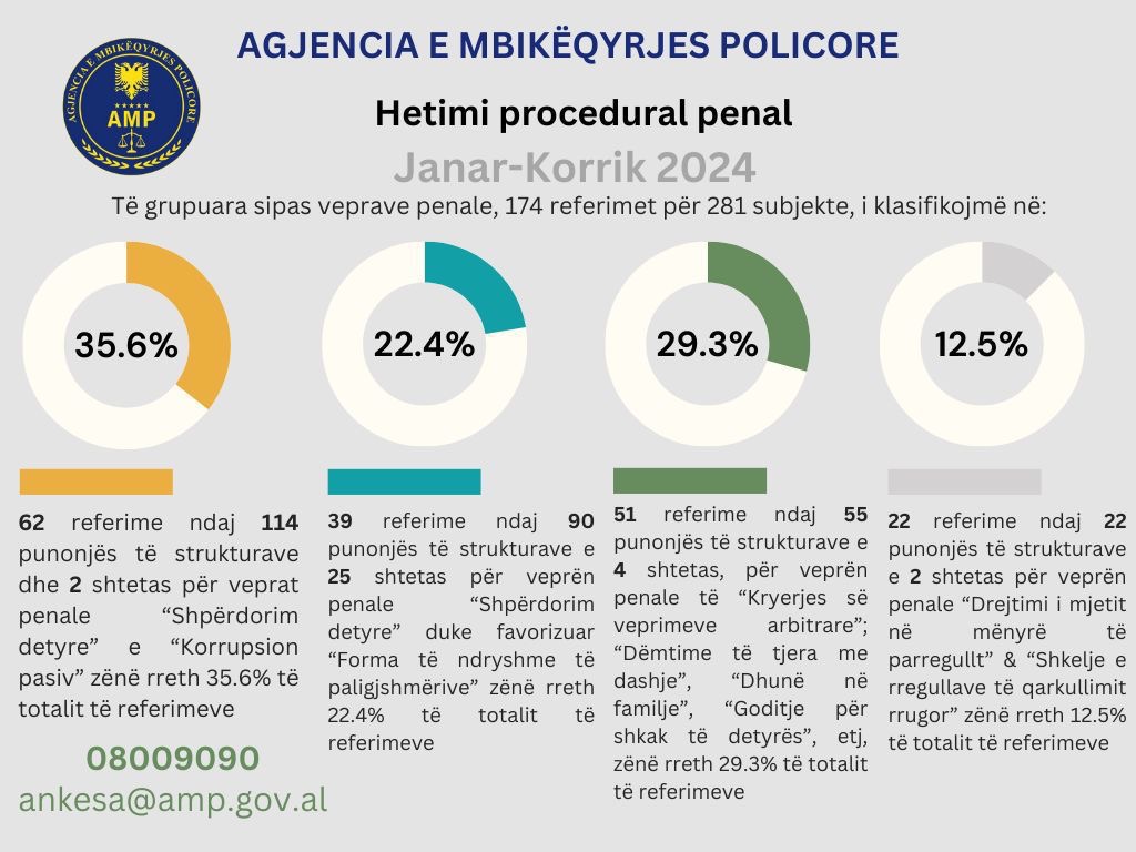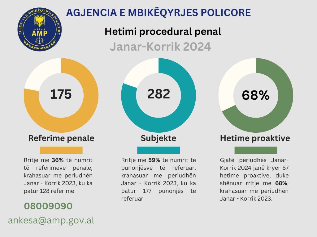 Agjencia e Mbikëqyrjes Policore për periudhën Janar – Korrik 2024 ka synuar rritjen e eficencës së hetimeve proaktive në funksion të goditjes së paligjshmërisë, në radhët e punonjësve të strukturave, kryesisht të Policisë së Shtetit, duke synuar nivelet e larta, të mesme e të parë drejtues të menaxhimit policor, jo vetëm ato në nivelet zbatuese / operacionale. Gjithashtu fokusi është vënë në strukturat me risk të lartë korrupsioni, si kufiri, policia rrugore, hetimi i krimit, shërbimet ndaj të tretëve, etj.