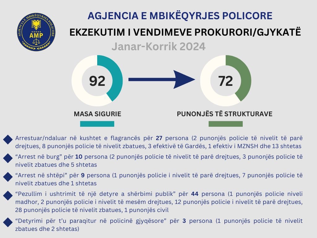 Krahas referimeve nga strukturat e hetimit të agjencisë, në cilësinë dhe përmbushjen e atributeve të Oficerit të Policisë Gjyqësorë, janë kryer me iniciativë ndalimet/arrestimet në kushtet e flagrancës si dhe ekzekutuar Vendimet e Gjykatave për masat e sigurisë të karakterit ndalues dhe shtrëngues, 92 masa ndaj 72 punonjësve të strukturave e 21 shtetasve, e konkretisht: