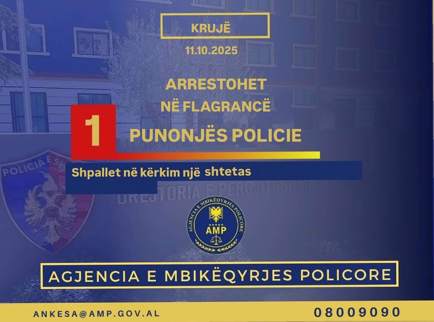 Agjencia e Mbikëqyrjes Policore (Rajoni Durrës – Kavajë) në bashkëpunim me Komisariatin e Policisë Krujë dhe DVP Tiranë, nën drejtimin e Prokurorisë Pranë Gjykatës së Shkallës së Parë të Juridiksionit të Përgjithshëm Tiranë, ka arrestuar në flagrancë punonjësin e policisë E. L., me detyrë Trupë shërbimi / Patrullë e Përgjithshme në Komisariatin e Policisë Fushë – Krujë i dyshuar për kryerjen e veprave penale “ Kultivim i bimëve narkotike” dhe “Prodhim dhe mbajtje pa leje e armëve luftarake”.