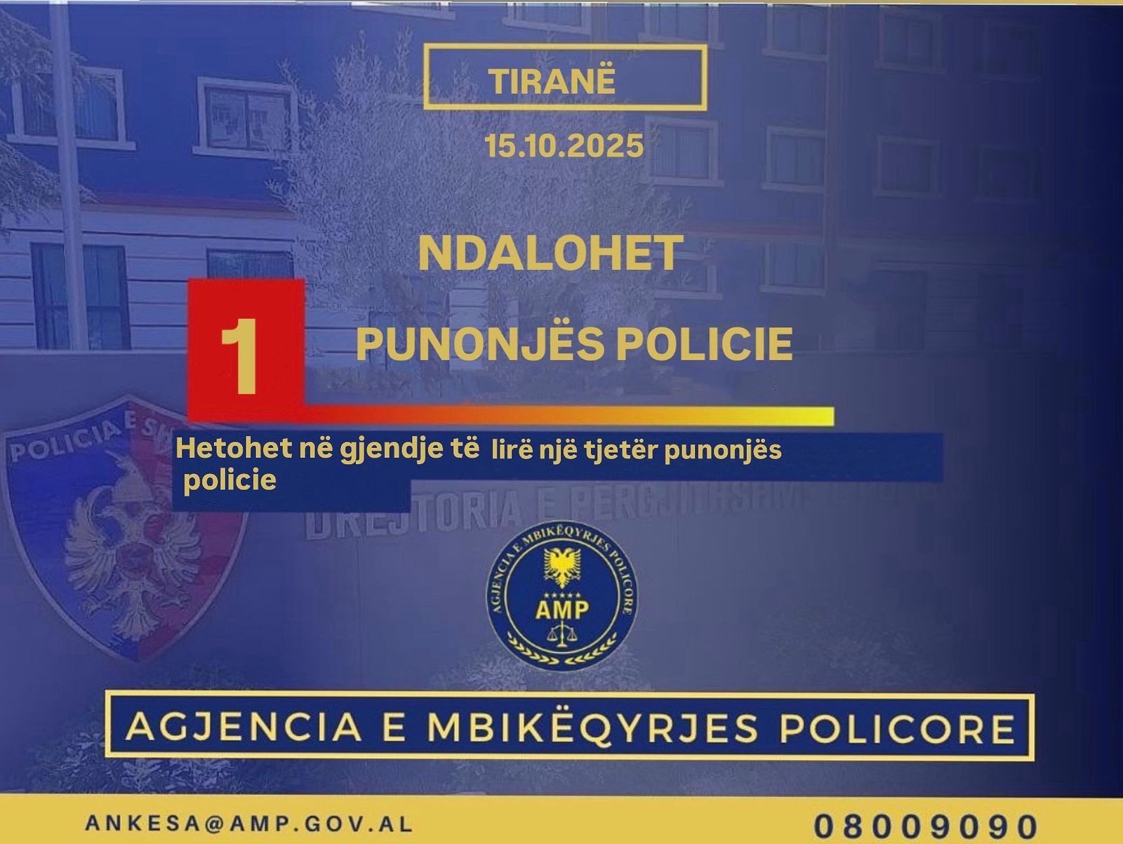 Agjencia e Mbikëqyrjes Policore (Rajoni Tiranë) ka ndaluar me iniciativë punonjësin e policisë Inspektor K. K., me detyrë Ndihmës Specialist / Kontrollor në Pikën e Kalimit Kufitar Rinas, i dyshuar për kryerjen e veprave penale “Shpërdorim i detyrës” dhe “Korrupsion pasiv i personave që ushtrojnë funksione publike”.